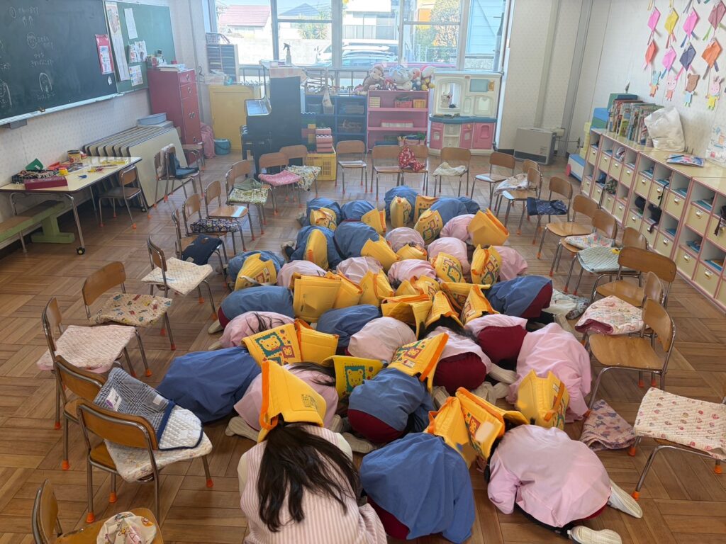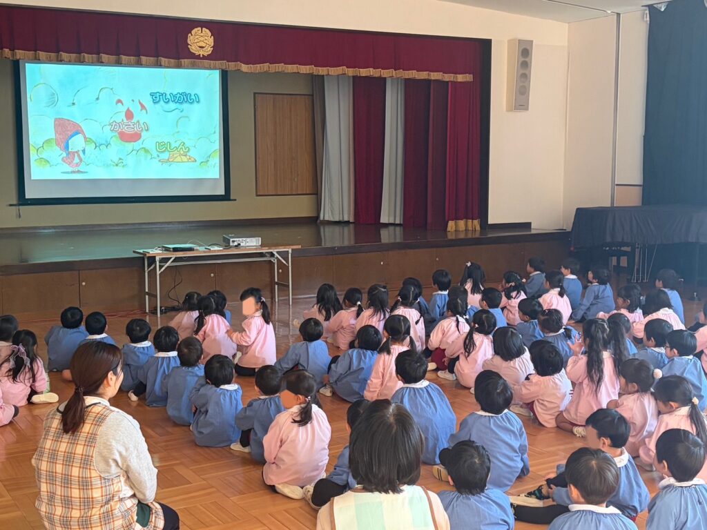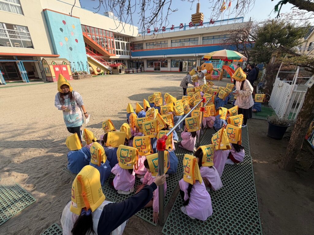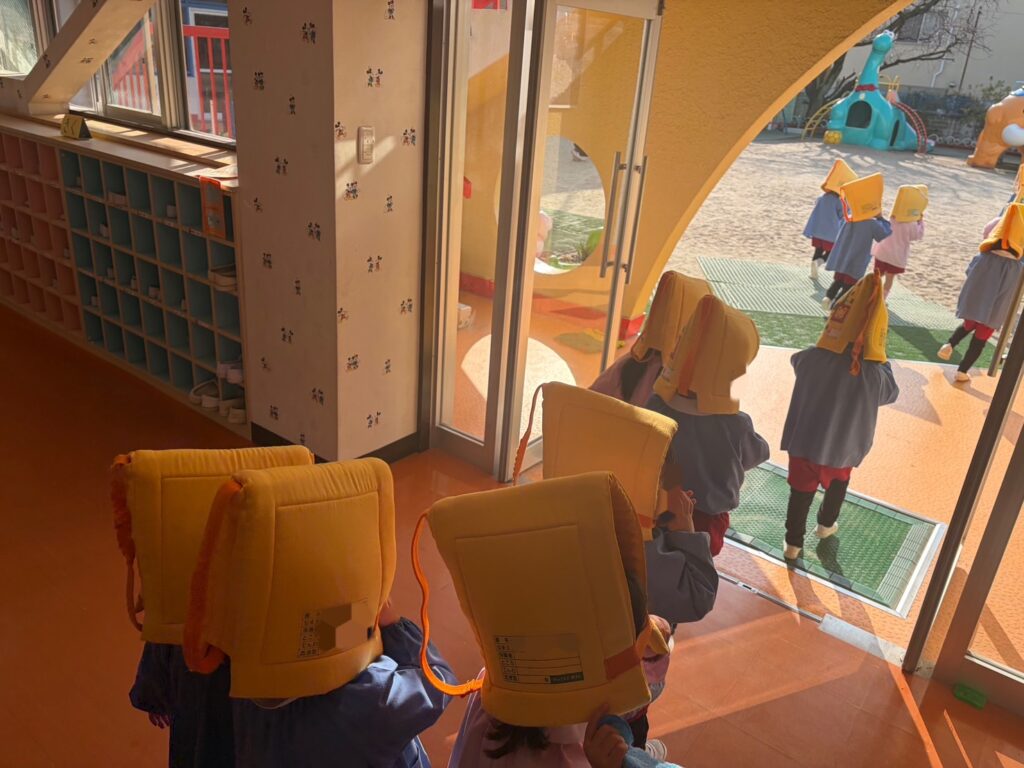 2026年1月16日 今日は避難訓練をしました🚒 地震が発生したと仮定し緊急放送がはいりました。教室で防災頭巾をかぶって園庭に避難しました。 前回の避難訓練より早くみんなで避難し全員の安全を確認することができました。よく頑張りました😃😃😃 講堂では、防災のためのDVDをみんなで観て、最後に園長先生から命の大切さのお話がありました。