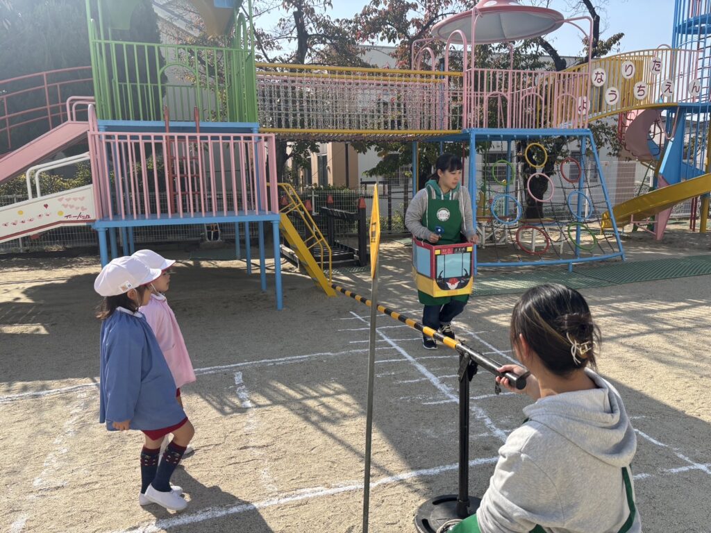 年少きく組さんが年中さくら組さんのリズム&ミニパラバルーン「my buddy」を教えてもらいながら踊りました♪