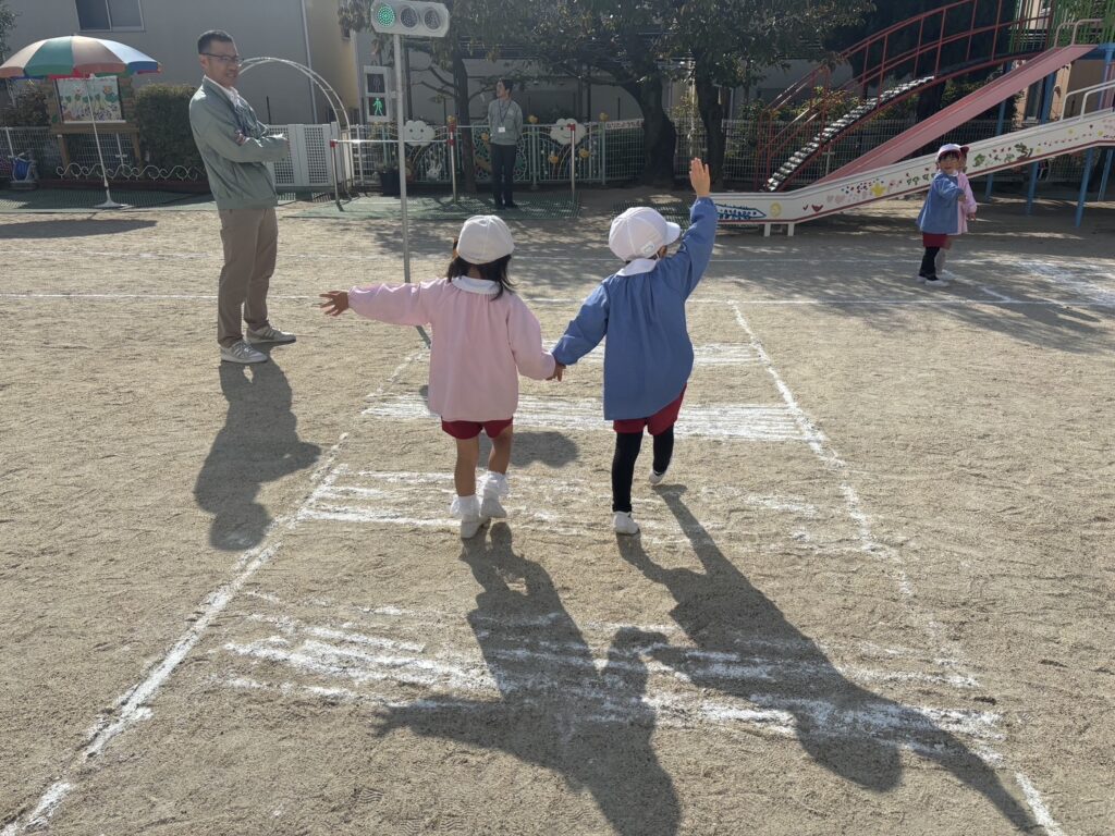 大きい組さんのお姉ちゃんに手をつないでもらい、手をあげて横断歩道を渡ります😃