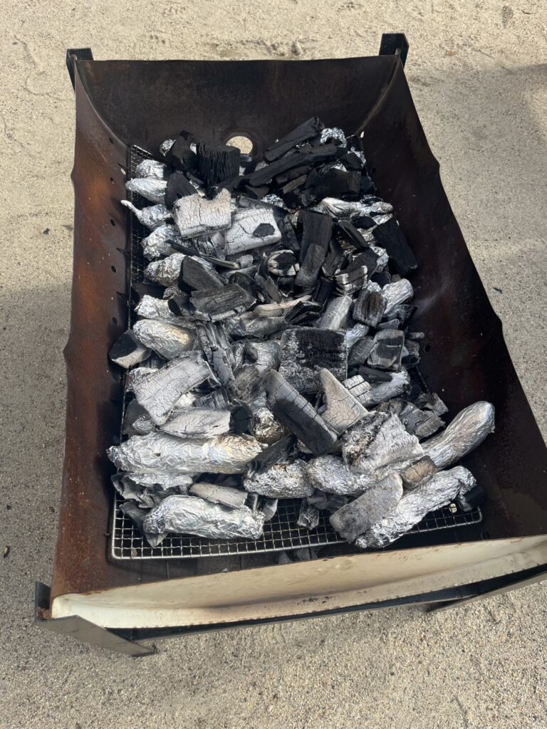 水にぬらした新聞紙に包みさらにアルミホイルを巻いて炭の中に置きます🍠🍠