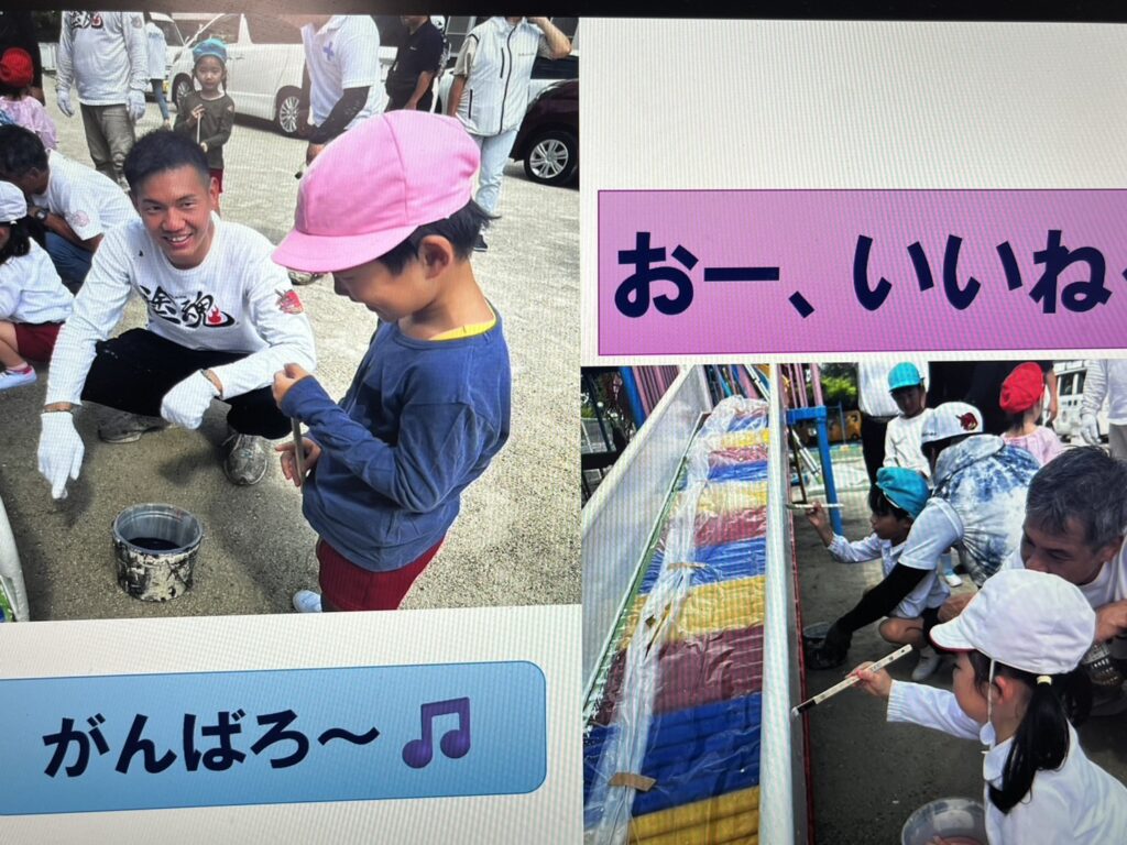 この写真は、昨年塗魂ペインターズがボランティアで遊具を塗ってくれ、園児が絵を描いている場面です😃😃