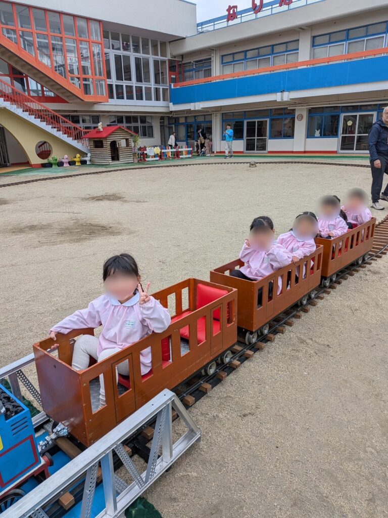 つくし組👉未就園児👉年少きく組👉年中さくら組👉年長ふじ組 の順番できっぷを渡して乗車🎵出発進行~!