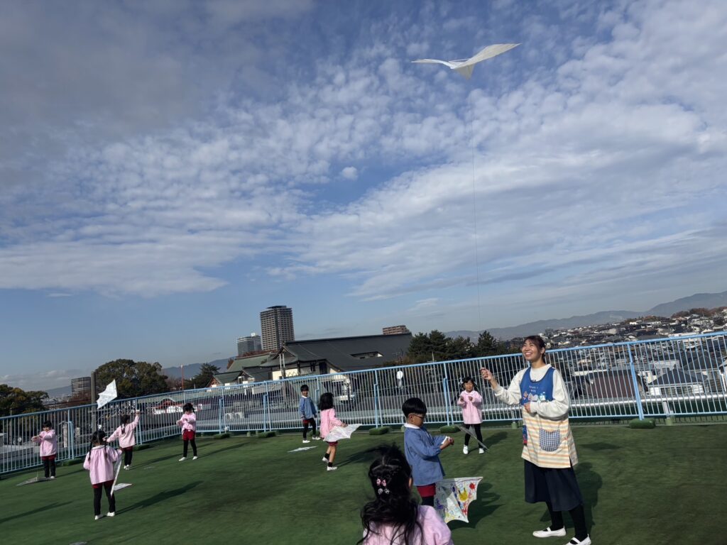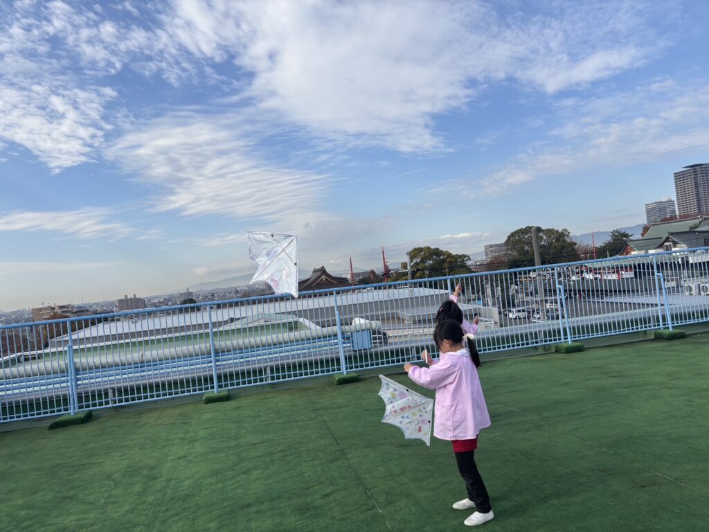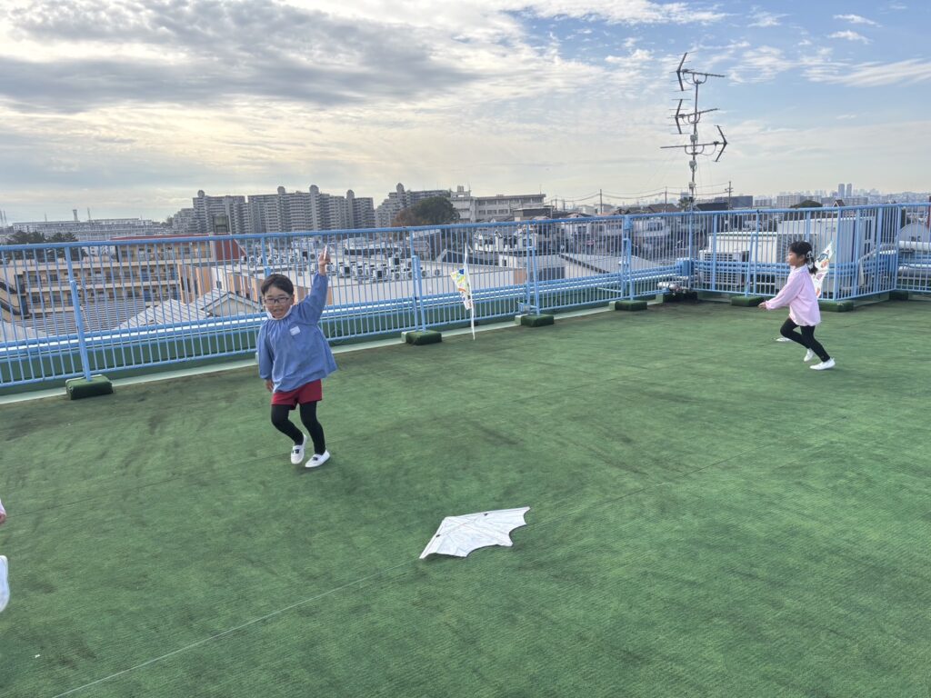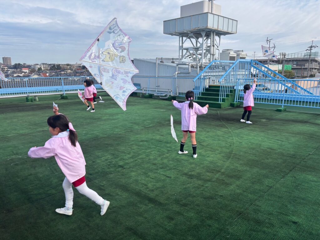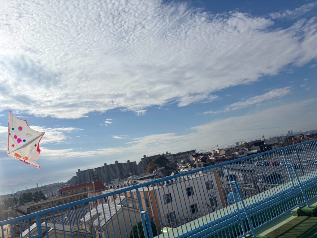 今日は年長ふじ組さんが幼稚園の屋上で凧あげ大会をしました!😃