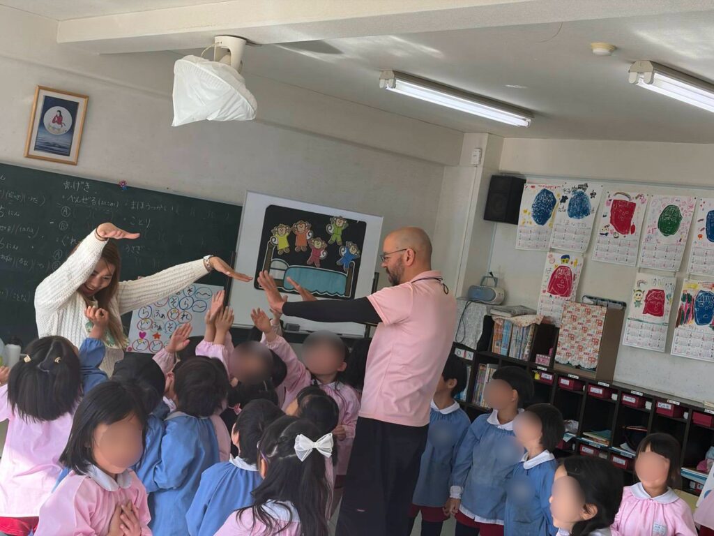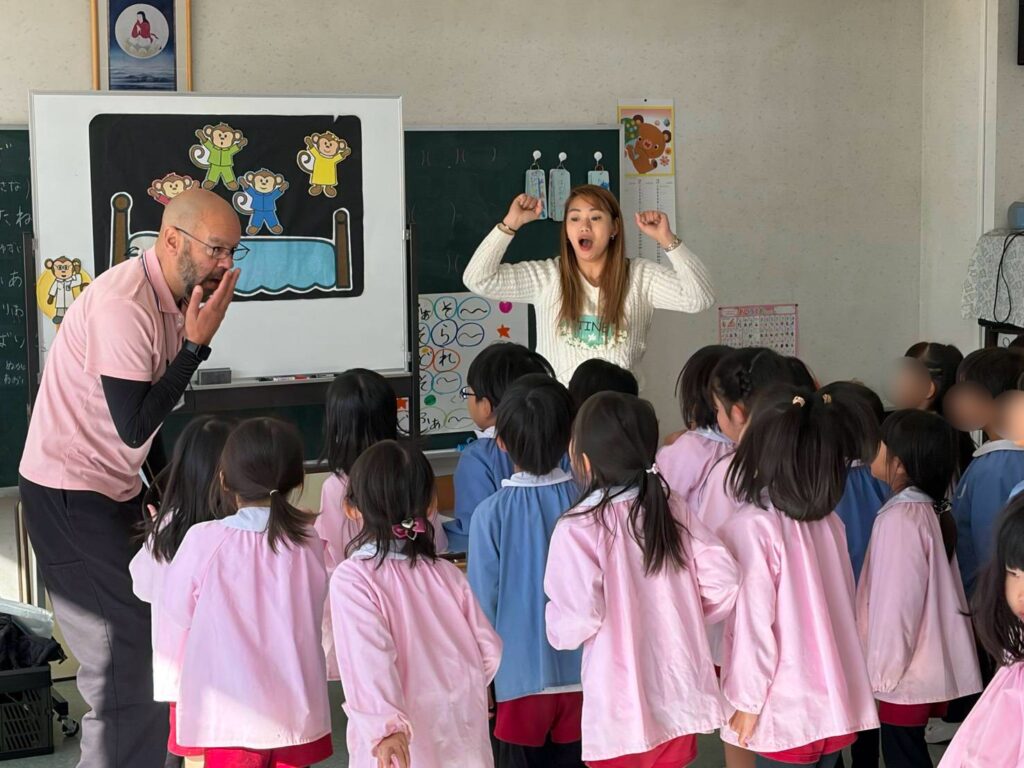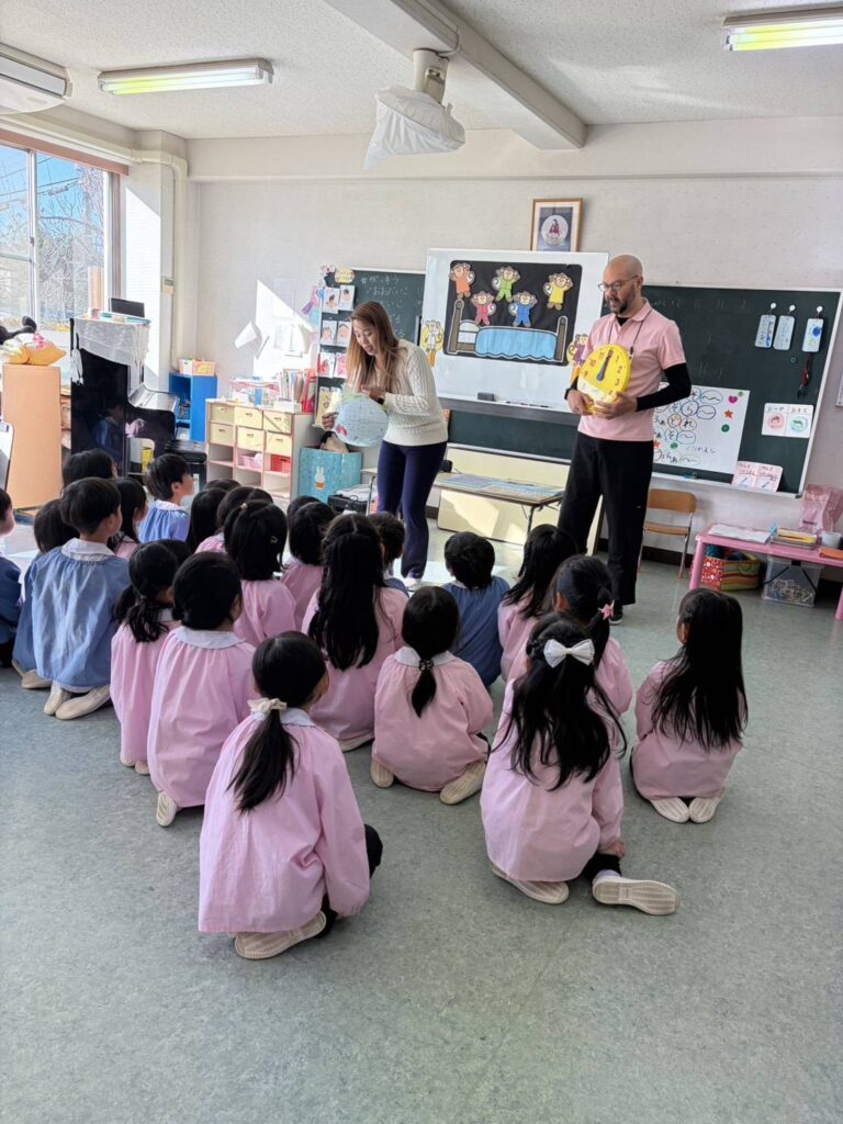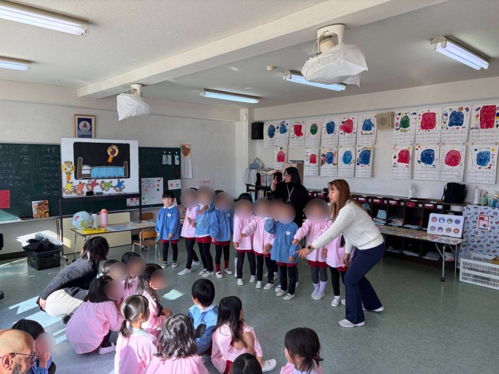 ①年長ふじ組さんは、今日ははじめての英語村体験です。まず、先生から自己紹介です。🌎🛫🕑